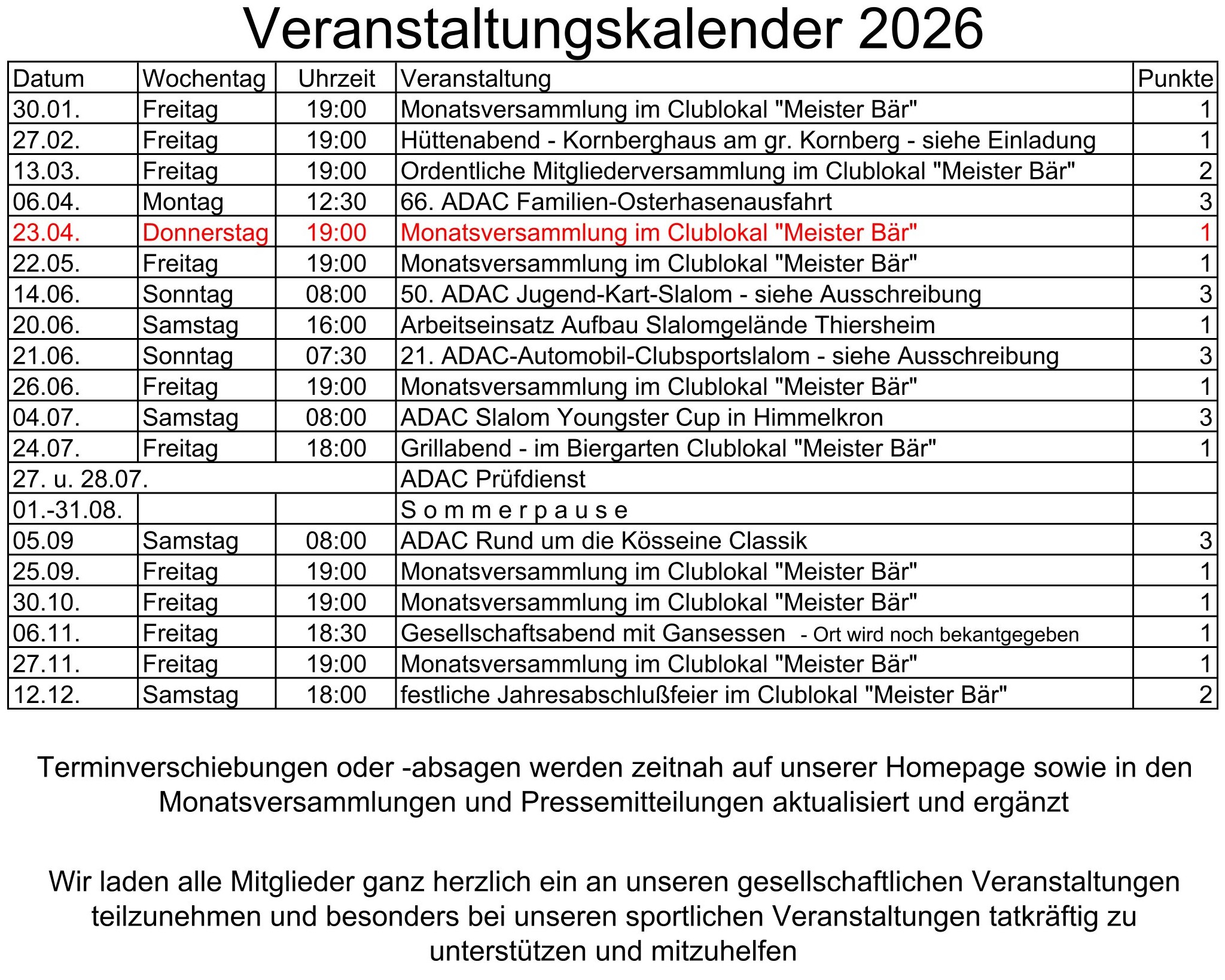 +++   VERANSTALTUNGSHINWEIS: am Donnerstag den 23. April 2026 ab 19:00 Uhr - Monatsversammlung in unserm Clublokal "Meister Bär"  +++
