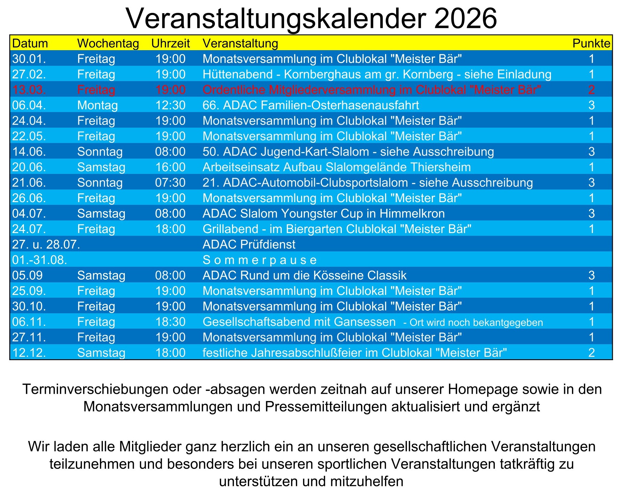 +++   VERANSTALTUNGSHINWEIS: am Freitag den 13. März 2026 ab 19:00 Uhr - ordentliche Mitglederversammlung in unserem Clublokal "Meister Bär"  +++